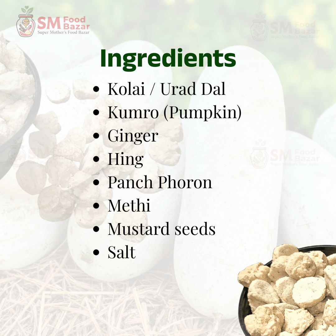 Authentic Bengali handmade bori made with pumpkin (kumro), urad dal (kolai), and aromatic spices. Sun-dried, preservative-free, and perfect for Bengali dishes like shukto, dalna, or ghonto.